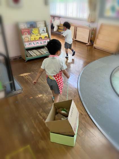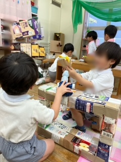 前日にばら組、すみれ組に自分たちがつくったサンドイッチを持っていき、食べてもらった嬉しさを感じたもも組の子どもたちは、今日も朝からサンドイッチ屋さんの準備を始めました。そこへすみれ組さんもやってきて。