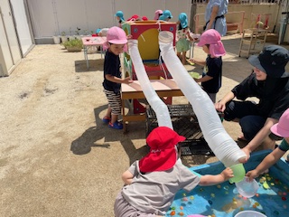 その遊びの中で、どのようにしたら、ボールが転がるかと何度も転がし方を試したり、水がこぼれないように樋の組み方を工夫したりと、考える姿があちらこちらで見られました。もっと、楽しくなるためにはと、自分たちで考えることで、遊びも楽しく発展していきますね!