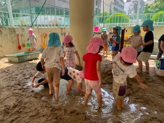 水鉄砲遊びやスーパーボール転がし、砂場でプールづくり…など、水の気持ち良さを存分に楽しみながら遊んでいます!