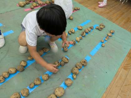 すみれ組は、収穫したジャガイモがいくつあるのかが気になったので、みんなで並べて数えてみることにしました。「500個くらいかなあ?」「今100個だから、300個くらいじゃない?」と、それぞれ予想をしながら数えることを楽しみました。結果は?食べられるジャガイモだけで261個でした!みんなで分けて持って帰るのが楽しみですね♪