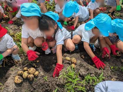 掘っても掘っても出てくるジャガイモに、「まだまだあるよ!」「おうちにいっぱい持って帰れそう!」と大喜び!手よりも大きいジャガイモ、コロコロ小さな赤ちゃんイモ、いろいろな大きさや形のジャガイモが収穫できましたね♪