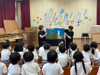 島之内図書館からお二人の方が来てくださり、大型絵本や紙芝居、組み木などを使ってお話をしてくださいました。