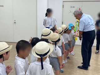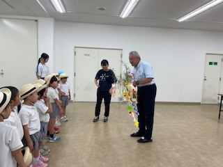 いつもお世話になっている南船場会館で笹飾りを飾っていただこうと、南幼稚園子どもたちの代表として、すみれ組全員で届けに行きました。「飾ってください」とみんなで気持ちを伝えました。