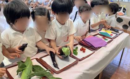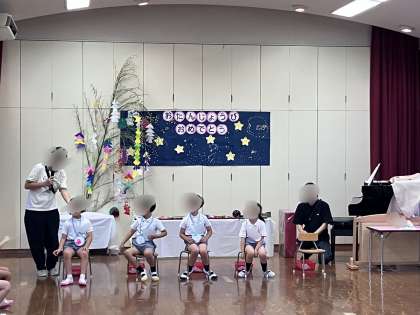 七夕飾りの由来の話を聞いたり、たなばたさまの職員劇を見たりして、七夕の行事に親しみました。