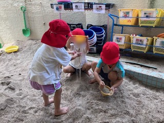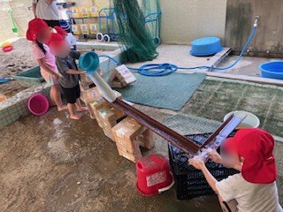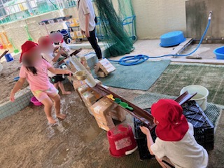 そうめん流し?スコップ流し!(ばら組3歳児)