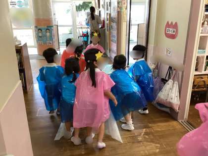 「もも組さんのところとすみれ組さんのところにも行こうー!(ついでにこの服も見せたいな)」と、他クラスの保育室もチラリ。