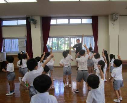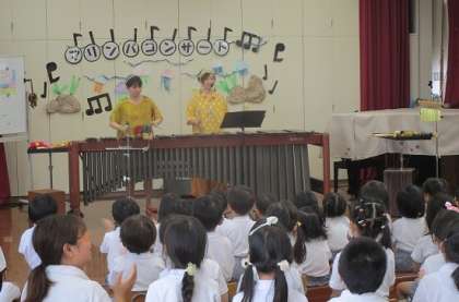 今週は、3歳児、4歳児、5歳児の子どもたちが広くて涼しいお部屋(リズム室)に集まって、のびのび体を動かして♪エビカニクス♪の曲で踊ったり、地域の方が幼稚園にマリンバ奏者(ハッピーパーカッションさん)の方を招いてマリンバ演奏会を楽しんだりしました。