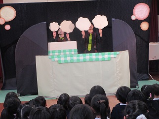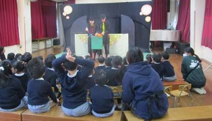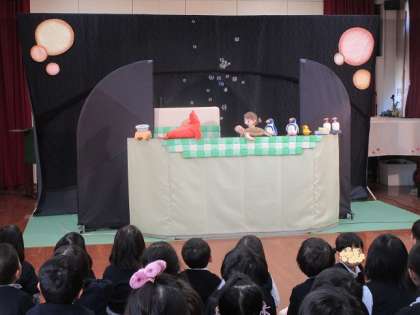 人形劇団"京芸"さんにたくさんのお人形を連れてきてもらい、お話をしてしてもらいました。手作りのあたたかみのある人形達の繰り広げる世界に、子どもたちも目をキラキラさせながら引き込まれていました。劇団の方たちに命を吹き込まれた人形達のユーモラスな動きには、言葉を超える楽しさを感じていました。終わった後には、「あー、楽しかった!」と思わず声があがるほど。人形劇を見る子どもたちの笑顔もとても輝いていました。