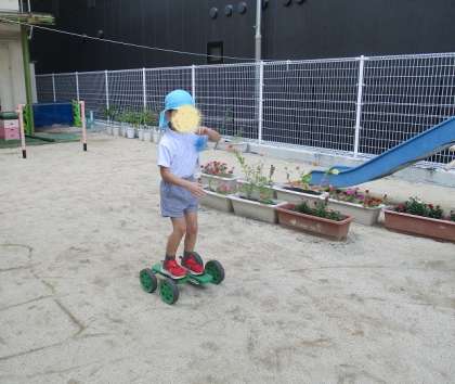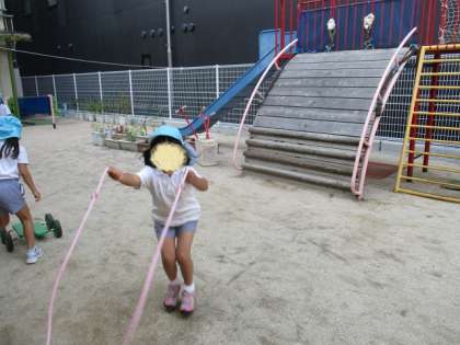 登園すると、大急ぎで身支度を済ませ、園庭に出てくるすみれ組の子どもたち。「今日はホッピングやってみる」「昨日より縄跳びをたくさん跳びたい」と、やる気いっぱいです。「先生、見て!」の声もたくさん聞こえてきます。ホッピング・縄跳び・ペダルローラー・一本歯下駄、どの遊びも難しいですが、やってみようとする気持ち、明日も続けようとする気持ちがとても素敵ですね♪