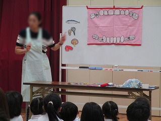 歯みがき指導では、歯科衛生士の先生から、むし歯にならないための4つの約束として「しっかり歯をみがくこと」「なんでもよく噛んで食べること」「おやつの時間を決めること」「寝る前の歯みがきと仕上げみがきをすること」を教えてもらいました。そして、お話の後は実際に歯ブラシを持って、丁寧な歯みがきの仕方を教わりました。歯みがきの後は歯がつるつるになり、みんな上手に歯みがきができました。