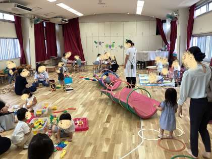 幼稚園の子どもたちとリズム室で遊んだり、「ピカピカブー!」の体操をしたりして遊びました。