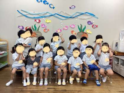 いつもは保育室で積み上げたり並べたりして遊んでいますが、今週は広いリズム室で、車のハンドルに見立てたり、頭に乗せてヘリコプターにしたりしてみんなで楽しみました。