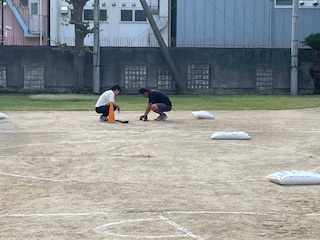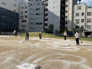 今日は、教職員みんなで、運動会に向けて、グラウンドにポイントの杭を打ったり、にがりまきをしたりしました。