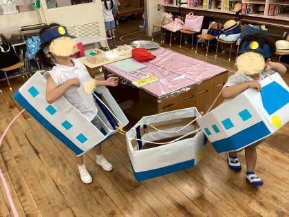室内では、箱に入って楽しむ遊びから、電車遊びになり、保育室や廊下に線を引いて電車遊びを楽しんでいます。