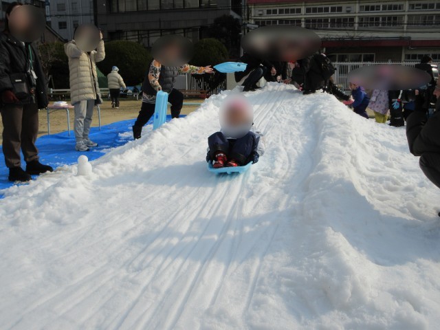 ソリに乗って勢いよく滑る楽しさに、何度も繰り返し挑戦していました。
