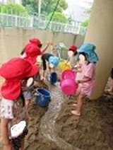 園庭では、泥んこ遊びを楽しんでいます。 砂場では、川を作ったり、大きな穴を掘っ...