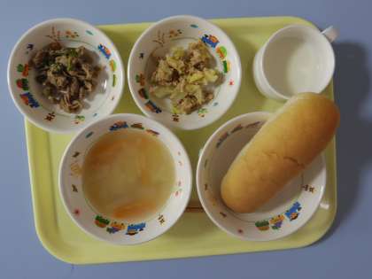 ぶたにくのガーリックやき スープ ツナとキャベツのソテー ぱん ぎゅうにゅう