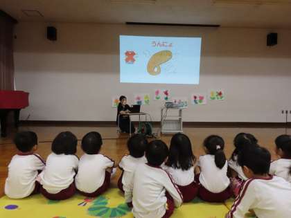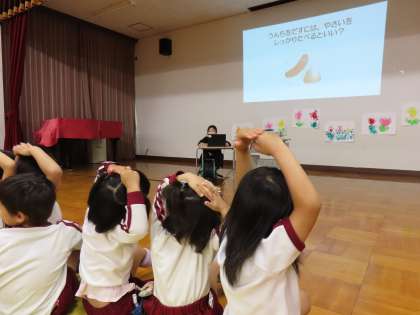 うんこはどうしたらできるのかについて、食べ物が体の中に入ってからどう動くかが分かるアニメーションを見せ、形や大きさ・においで、その日の体調が分かることを知らせました。