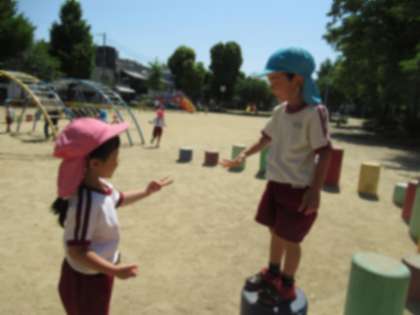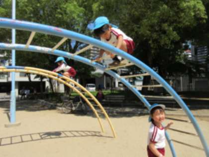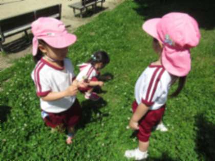公園では、様々な遊具があり、きれいな花もたくさん咲いています。子どもたちは、好きな遊びを見つけて駆けて寄っていきました。大きなすべり台を滑ったり、うんていに挑戦したり、友達と追いかけっこしたり、周囲にたくさん咲いているシロツメクサを集めたり… それぞれが、好きな遊びを楽しんでいました。