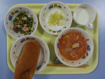 ケチャップ煮 ベーコンとさんどまめのソテー キャベツのサラダ 黒糖パン ぎゅうにゅう