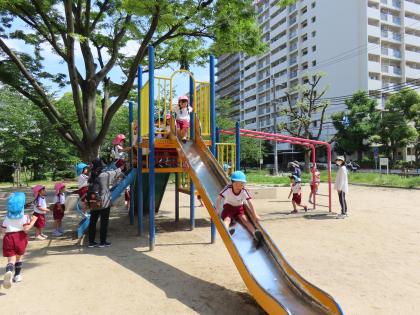 土佐公園では、虫を捕ったり、固定遊具で遊んだり、のびのびと遊びました。公園内にある土佐稲荷神社に行き、鳥居をくぐったり、狛犬やお稲荷さんを見たりしました。「鳥居がたくさんある!」「こっちの狛犬は口を開けてる!」などたくさんの発見がありました。