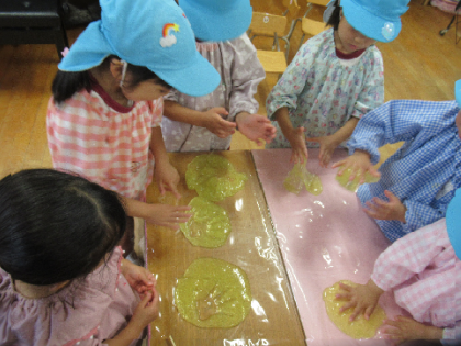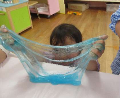 上から垂らしてみたり、机の上でこねたり、手を包んで手袋みたいにしたり、いろいろな形に変わることや、予測できない形になることも楽しんでいます。スライムを薄く大きく広げると、キラキラして鏡のよう。魔法使いごっこで遊んでいる4歳児はな組が、「鏡よ鏡よ鏡さん、世界で一番美しいのはだあれ?」「それはあなたです」「キャー!」と、ごっこ遊びも楽しんでいました。
