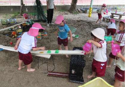 砂場では、といをつなげて水を流したり、転がるものを探して水の勢いで転がしてみたり、いろいろと考え工夫して遊んでいるので、面白いです。