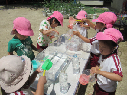 水をペットボトルやコップにくんだり、移し替えたり、こぼしたりするのも楽しくて、繰り返し遊んでいます。