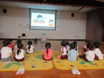 子どもたちに「歯みがきをしないとどうなる?」と問うと、「むし歯になる」と、一斉に返ってきました。そこで、昨年度、大阪市立幼稚園教育研究会 保健研究部で作成した「どうしてむし歯になるのか」についての動画を見せました。