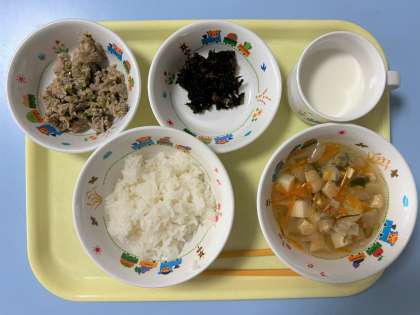 調理されたのりのつくだに。ごはんにのせたり、混ぜたりしながらいただきました。少しずつお箸でつまんで食べる子どもや、ぶたにくのあじつけやきものせて食べる子どももいました。おいしかったね。ごちそうさまでした。
