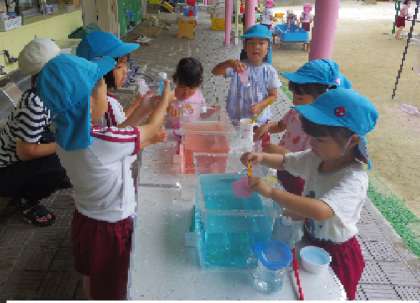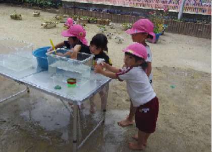 今、幼稚園のみんなが楽しんでいる水遊びや、砂場での泥んこ遊びなどを一緒にしました。楽しかったね。