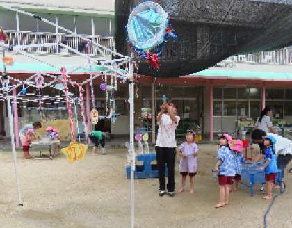水鉄砲でもたくさん遊びました。的をどうやってつくったか、自分はどの的まで水を飛ばすことができるか、など、参加してくれている先生方に話を聞いてもらいながら、遊んでいました。「魔法」で、前日よりも高くなった的もあり、「高くても当てられるで!」と、自信満々で挑戦していました。