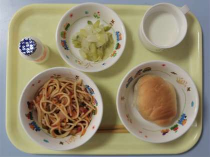 チキントマトスパゲッティ グリーンアスパラガスとキャベツのサラダ はっこうにゅう 1/2パン ぎゅうにゅう