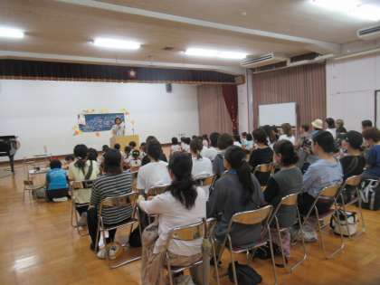 その後、4歳児はな組は「みずてっぽう」の歌を、5歳児そら組は「あたまであくしゅ」のふれあい遊びを保護者の方に見てもらいました。