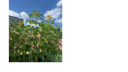 園庭をふと見ると、5歳児そら組が植えたヒマワリがとても大きくなり、綺麗な花を咲かせていました。暑さに負けず、太陽の光をたっぷり浴びて生長している姿を見て感動しました。植物の生命力はすごいなと感じました。
