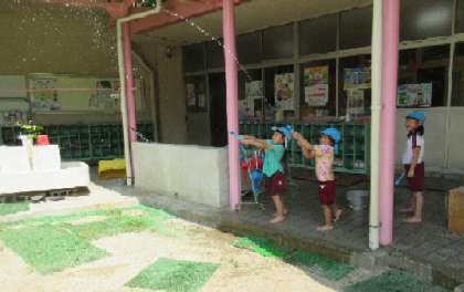 幼稚園では、ぞうぐみのお友達が、暑さ指数を確認しながら、朝、少しの時間、水遊びを楽しんでいます。