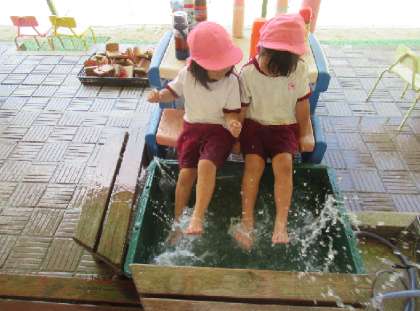 「桜の葉っぱまで飛んだー」と水鉄砲をしたり、「足だけプール」でバシャバシャバタ足をしたり…