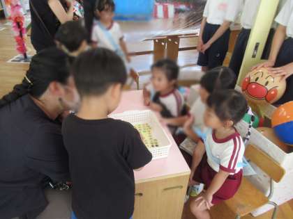 「いらっしゃいませ〜!」「楽しいですよ〜!」と、お客さんを呼び込んだり、「こうやってやるんだよ」と教えたり、「すごい!できたね!」と未就園児で参加している子どもを認めたりと、お客さんのことを考えながら接客をしていました。