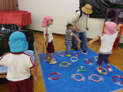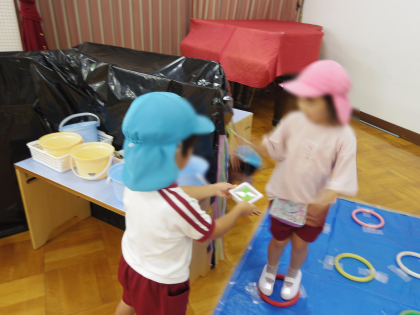 お家の方々がされていたように、手裏剣を配ったり、魚つりのバケツや竿を渡したり、ひよこの友達のカードにシールを貼ってあげたり、好きな遊びを繰り返し楽しんだりなど、自分で決めて遊んでいました。今日もお祭りの続きを楽しむことができました!