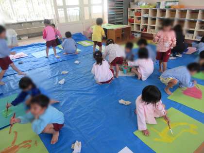 4歳児はな組の時より大きな画用紙を見て、「すごーい!」「早くかきたい!」と、それぞれが筆をもってかき始めました。