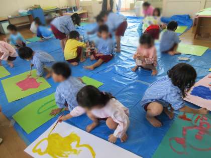 大きな画用紙に、腕を大きく動かして黙々と、いろいろな色や筆の太さなどを使い分けながら、思い思いにかいていました。