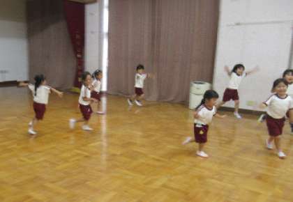 神戸どうぶつ王国に園外保育に行った次の日、4歳児はな組は、見たことや感じたこと、楽しかったことなどを、体で表現して遊びました。トリのショーで、羽を広げて飛んでいる様子が特に驚いて印象に残っていて、「こんなに羽広げて飛んでた」「フープもくぐるよ」と遊戯室を羽を広げて飛びまわりました。アリクイやナマケモノが木の上にいたことも面白かったようで、子どもたちも(床で)枝にぶら下がっていました。