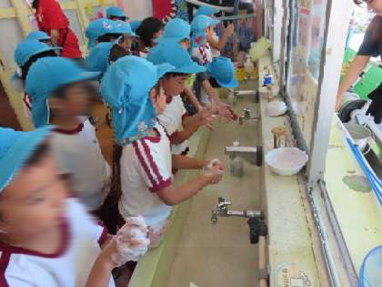 保健指導の最後に『あわあわ手洗いの歌』を聴きながら一緒に振り返り、ばい菌に見立てたスタンプを手のひらに押して、さきほどの「よごれ」と一緒に洗い流し、うがいも実際にみんなでやってみました。