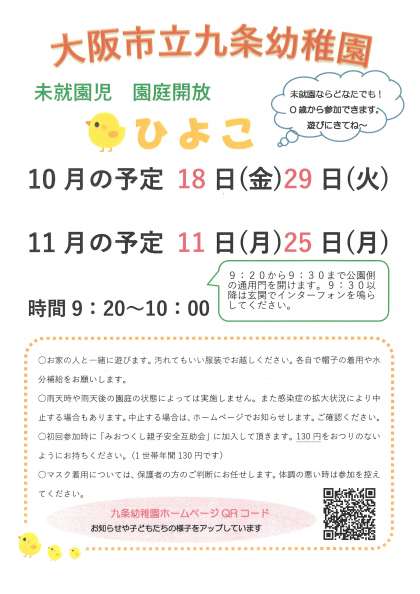 未就園児園庭開放「ひよこ」の10月、11月の予定をお知らせします。