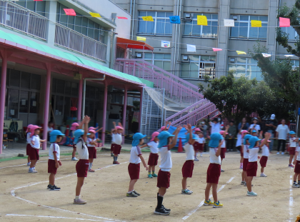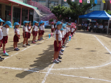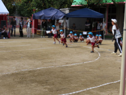 たくさんのお家の方、お客様にきていただき、子どもたちは、うれしさいっぱい、ちょっとドキドキといった様子です。開会式、体操、各クラスのかけっこからスタートです。