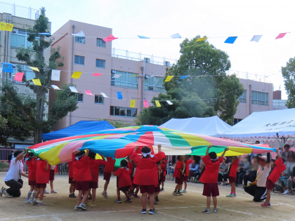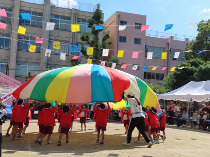 網にかかった魚たちが、パラバルーンの中で跳ねました。やったー、大漁だ!!