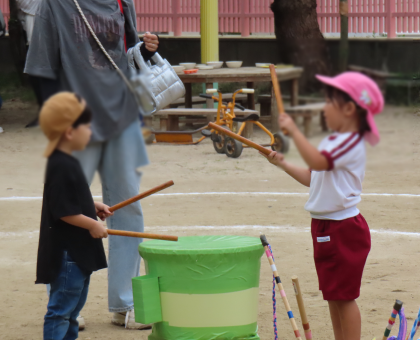 運動会でしていたUFO型玉入れや太鼓も「こうするねんよ」などと言いながら一緒に楽しんだり、見守ったりしていました。