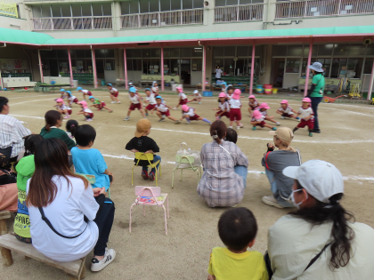 5歳児そら組が運動会で披露したソーラン節を、今日は4歳児はな組も一緒に踊りました。運動会前からずっと見て真似てきたはな組の子どもたちは、自信満々です。大きな掛け声を言いながらしっかりと体を動かして、まるで今日が運動会のようでした。見ていただけたことがとてもうれしかったようです。