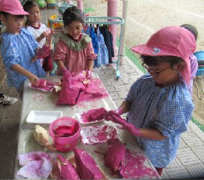 新聞紙や封筒を使って、「こんなに大きいおいもが出てきたらどうしよう」「私のこんなにちっちゃいおいも」と、それぞれどんなサツマイモが出てくるか、想像しながら、自分のサツマイモをつくりました。「おいもの色が違う!」「色つけたい」という声があがったので、絵の具を用意しました。絵の具を含ませたスポンジでゴシゴシ塗って、「洗ってるみたい」と友達と笑ったり、手で塗って「手までおいもになっちゃった」と、絵の具の感触を楽しんだりしていました。