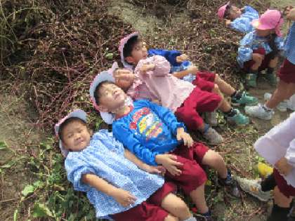 自分のサツマイモを掘り終わったら、予備のいもを掘りました。まだまだパワーいっぱい!頼もしいです。畝の横に積んであった、ツルの山に、ゴロリと寝転んで、ちょっと休憩。ふかふかで気持ちよかったね。
